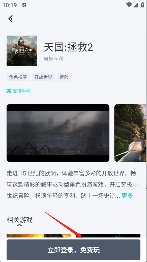 5、点开想玩的游戏进入详情页,点击“立即登录,免费玩”即可。