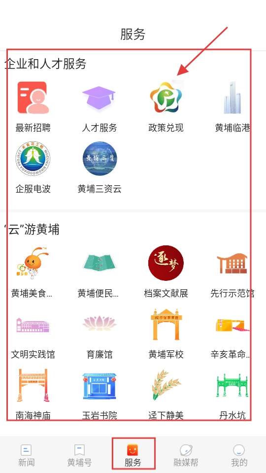 4、进入服务板块后,能查看企业与人才服务、云游黄埔等各类服务,大家可以挑选所需的服务来使用。