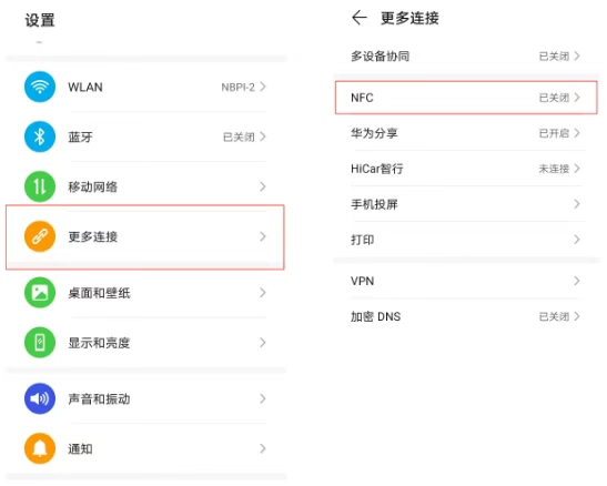 首先我们要准备一部具备NFC功能的安卓手机,接着把手机【设置】中的NFC开关开启。具体操作是进入手机设置界面,找到“其他网络与连接”或者“更多连接方式”选项,在其中的NFC设置处打开NFC功能开关。
