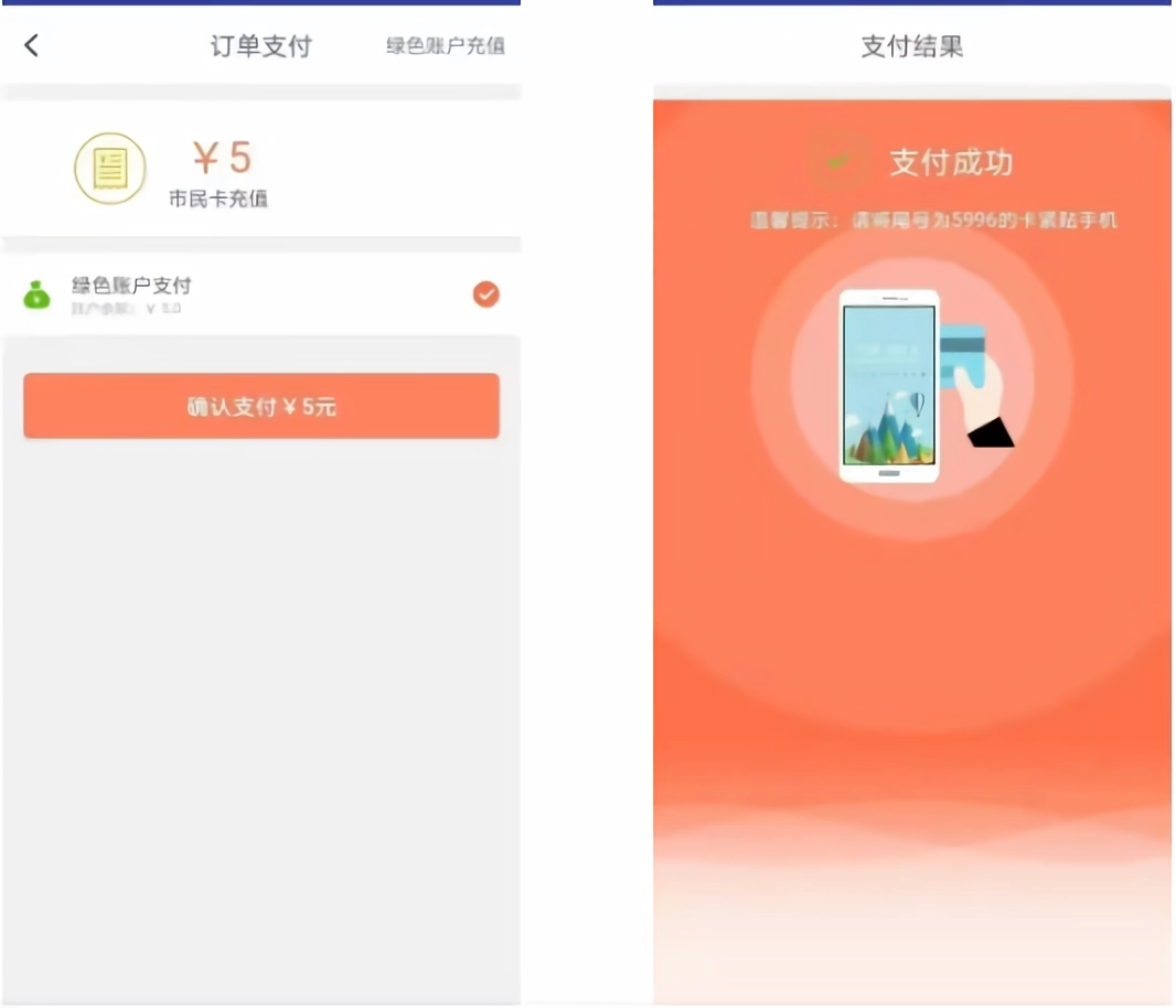 4、完成支付后,请再次将卡片紧贴手机的NFC天线区域,保持卡片位置不要移动。待充值操作完成并显示“充值成功”的提示后,请务必确认并查看充值的具体金额以及卡片当前的余额情况。