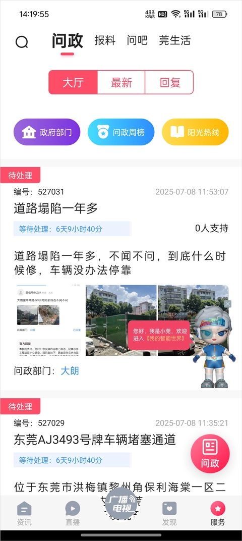 为解决东莞本地用户生活中的各种需求,“知东莞”客户端已建立完善的面向市民的政务服务、城市服务体系。其中, “阳光问政”旨在打通群众问政 “最后一公里”,让问政答政更方便更快捷,切实做到“让你看”,同时“帮你办”。不论何时何地,不论大事小事,只需通过“记者帮”提供图文、视频、音频任意线索,就可一键呼叫东莞广播电视台各路记者,帮你解决难题!此外还集成了一系列服务功能,包括各部门市民办事指南、酒店预订、车票购买、用车出行、天气查询等,让您办事不求人少跑腿!