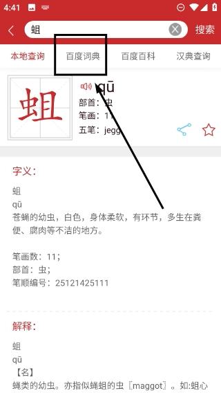 3、在查询结果页面,切换到【百度词典】标签,就能查看该字的详细解释(例如蛆的定义、笔画等内容)。