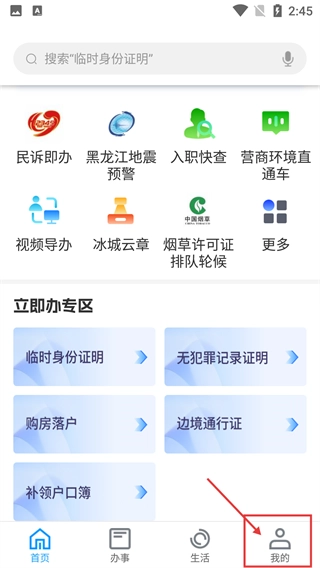 1、在应用首页底部的导航栏中点击【我的】选项,即可进入个人中心页面。此应用集成了【临时身份证明】【无犯罪记录证明】等多项政务办事相关功能。