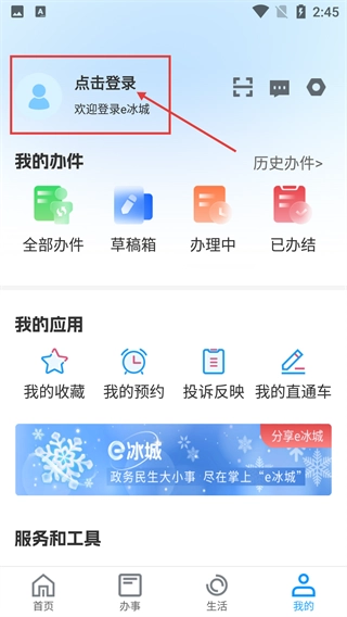 2、在个人中心页面点击【点击登录】的区域,进入账号登录流程,完成登录后就能使用【我的办件】等专属的政务服务了。