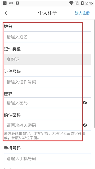 4、进入个人注册页面后,依次填写【姓名】与【身份证号码】,设置包含数字、大写字母和小写字母的密码,再填写手机号即可完成账号注册。