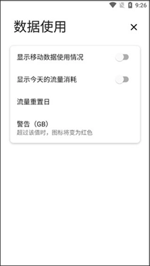 4、在数据使用功能板块中,用户可以开启显示移动数据使用情况、流量消耗量等等;