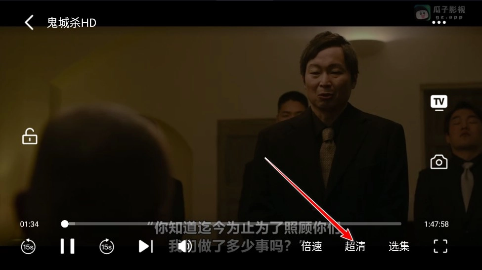 3.当处于全屏模式时,我们点击清晰度选项,例如我当前选择的是超清画质。