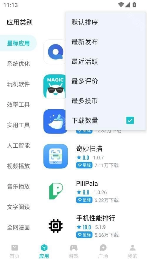 3、点击右上方的三点图标,可通过最新发布、最近活跃、最近评价、最多投币以及数量等维度筛选优质软件。