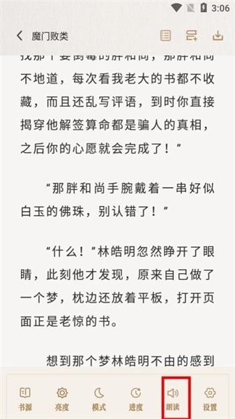 在小说的文字界面上单击,然后点击右下角的【朗读】按钮,就能启动听书功能了。