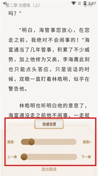 继续点击小说的文字界面,还能使用设置语速、调整章节、退出朗读等功能。