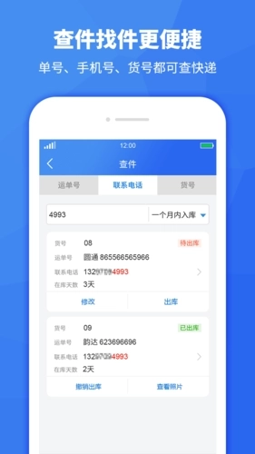 快递出库:可通过运单号、手机号或货号进行出库操作,同时支持多人多件合并完成出库。