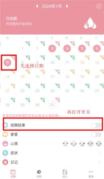 同样的方法,当姨妈结束时,点击日历上实际的姨妈结束日期;将“经期结束”的开关设置成打开的状态。