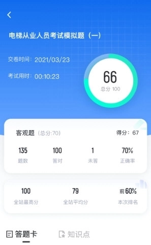 电梯操作员题库包含考点专项练习、全国通用卷与地区卷模拟练习,还有按固定考试比重随机抽题的真题考场。成绩单会实时记录考试数据,通过点滴反馈考生近期学习状态及正确率提升情况,助力考生增强通过考试的信心。