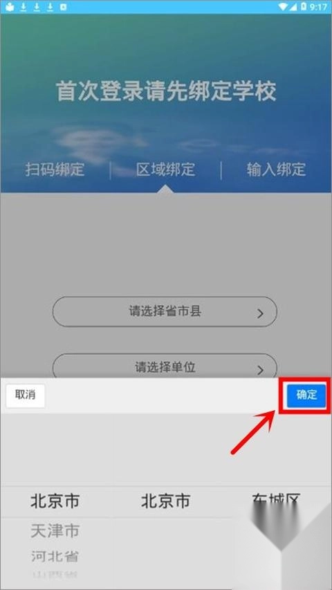 3、首次登录时需先完成学校绑定,绑定途径包括扫码绑定、区域选择绑定以及输入信息绑定三种方式。
