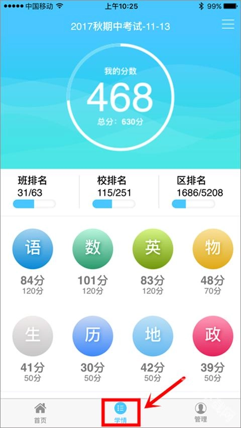 4、用户完成学校绑定后登录进入首页,点击底部的“学情”选项,就能查看学生各科目考试成绩。
