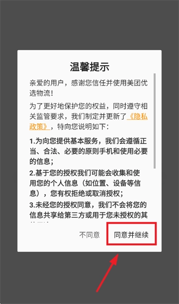安装并打开美团优选物流应用,在弹出的温馨提示界面点击“同意并继续”按钮。
