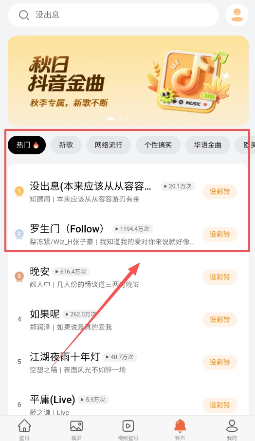 如果你平时也爱更换铃声,不妨切换到铃声板块看看。那里设有秋日抖音金曲这类热门分类,像《没出息》《罗生门》之类的歌曲都能找到,还能帮你挖掘不少当下流行的音乐。