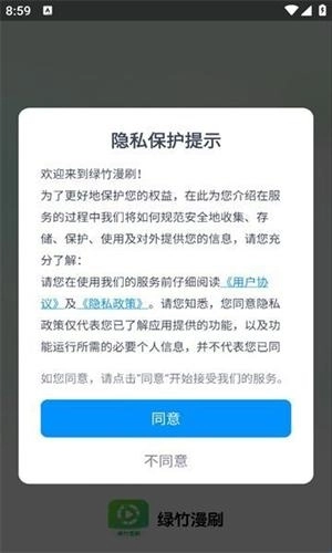 安装软件后打开,页面会弹出用户协议和隐私政策的同意提示,点击“同意”就能进入注册界面。