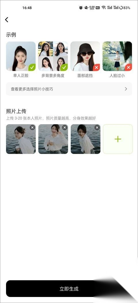 按照提示上传个人照片,数量要求在3到20张之间,照片数量越多,生成的形象就越贴近你本人。