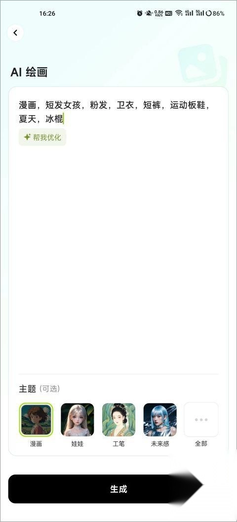 选好主题后,把你期望的图片风格描述清楚,细节越丰富,生成出来的效果就越理想。