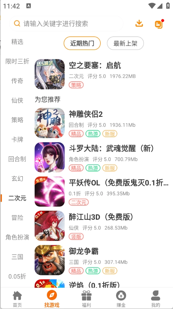 找游戏页面对各类游戏做了细致分类,涵盖仙侠、传奇、策略等不同类型。