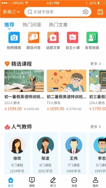 2、浏览首页展示的各类精选课程与人气教师,可迅速加入自己感兴趣的班级