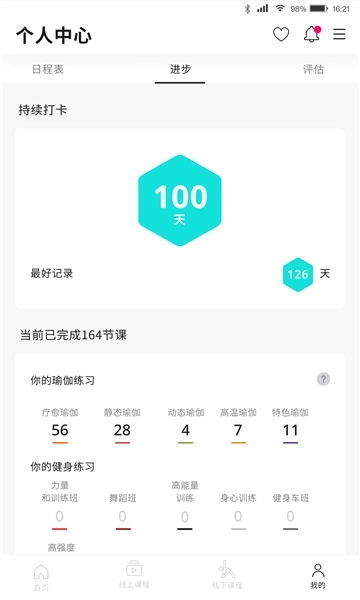 -【运动数据追踪】在App里,你能够追踪各类健身项目的进展情况,我们会为你呈现练习打卡天数、不同类型课程的上课节数等多样的个人数据。