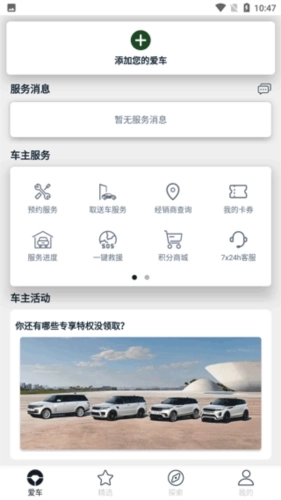 3、点击下方的“爱车”页面后,上方区域支持添加并绑定个人车辆,下方则提供了车主服务相关的基础功能板块。