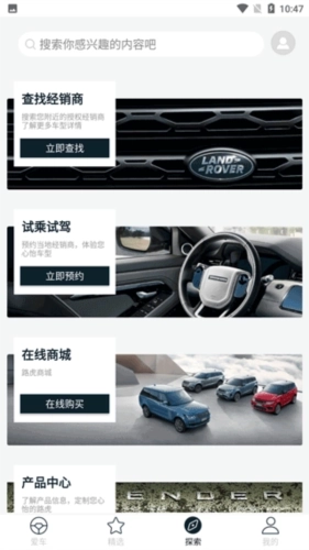 4、点击搜索后,内容里包含查找经销商、试乘试驾预约、在线商城等功能模块。你既可以通过这里定位到距离最近的经销商,也能直接在线预约试驾服务,甚至还能实现线上看车的需求。