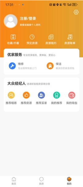 用户点击右下角的“我的”按钮就能进入个人中心,在这里可以查看自己收藏和预定的房源,成功租房后还能使用维修与保洁服务。