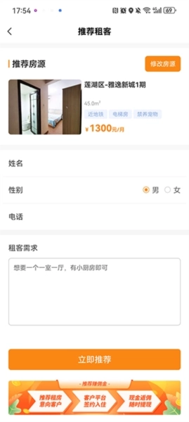 3、接着把好友的信息、电话以及需求填写完整,最后点击“立即推荐”按钮就可以了。