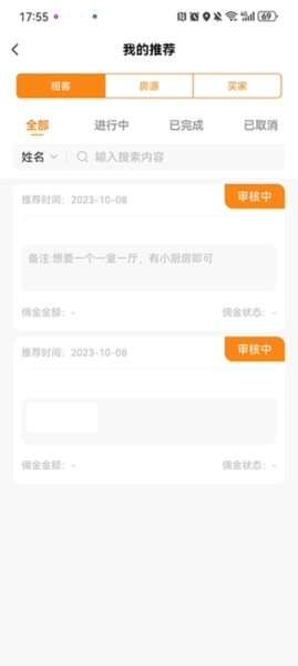 6、实时呈现推荐详情内容,其中包含推荐信息、佣金详情信息以及进度状态等内容;