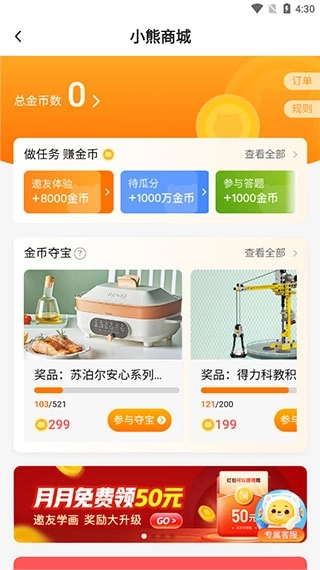 2、在小熊商城里,大家可以通过完成任务来获取金币,这些金币能用来参与夺宝活动赢取奖品。