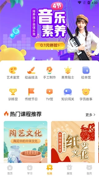 1、打开小熊艺术后,在首页能看到美术馆、文化手工馆、音乐馆、书法馆的相关课程,用户可根据需求选择学习。