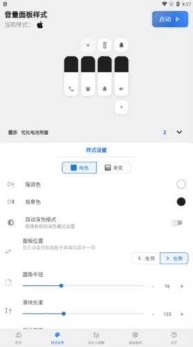 VolumeStyles是一款功能强大的手机主题美化软件,用户可借助它更换音量主题样式,这里汇聚了各类风格及不同系统的音量外观。它能彻底改变手机自带的音量面板外观,知名品牌系统的音量面板可随意使用,还支持调节面板的背景颜色、强调色、显示位置、圆角等参数,让用户轻松打造专属于自己的个性化面板,每天都能随时更换音量面板外观,告别枯燥乏味。
