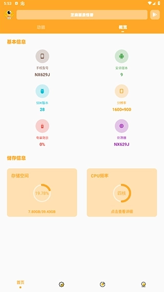 2、进入概览界面,可读取当前手机设备的型号、系统、分辨率、内存、CPU等信息,可以根据设备性能选择合适的画质,