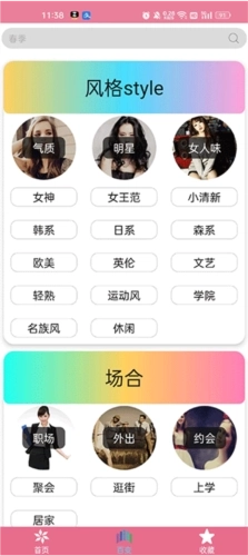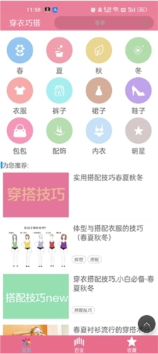 1、首先安装并打开穿衣搭配指导软件,首页有各种穿搭资讯,有春夏秋冬四个季节,还有各种种类;