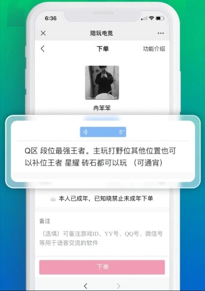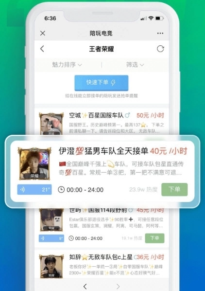 在这里就可以直接选择陪玩人员下单,你就能获取对应的陪玩服务