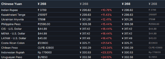 根据SteamDB的数据,这款游戏的国区定价是全球最低的!价格第二低的是印度区,为296.8元;第三低的是哈萨克斯坦区,定价298.6元。而价格最高的则是瑞士区,达到了531.8元。