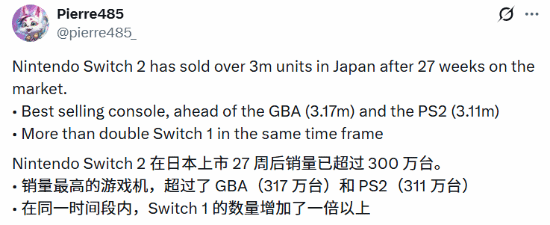 关注并分享视频游戏销售数据的Twitter/X用户pierre485_发布消息称,任天堂Switch 2在日本本土市场上市27周后,累计销量突破317.2万台。凭借这一成绩,它超越了同期销量317.1万台的Game Boy Advance和311.2万台的PS2,成为日本市场同阶段表现最为出色的游戏机。