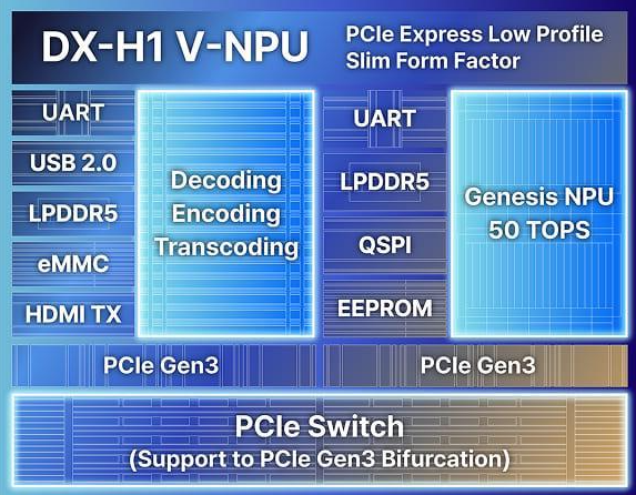 DX-H1芯片整合了多通道处理引擎与专用NPU架构,能够在单一芯片上实现视频输入、预处理、AI推理及重编码的完整流程,显著增强了系统集成度,相较于传统依赖独立GPU和硬件编解码器的方案,更为简洁高效。