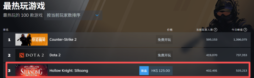 截至9月5日,《空洞骑士:丝之歌》在Steam热销榜上排名第一,其Steam平台的最高同时在线人数峰值已突破53万。