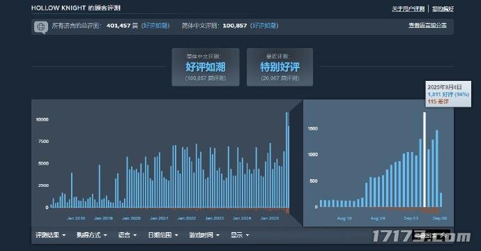 目前,《空洞骑士》在Steam平台的简体中文评价区依旧维持着96%的“好评如潮”评级,而且每日新增的评价数量甚至比《丝之歌》发售前还要多,这充分体现出玩家对它长久的喜爱与肯定。