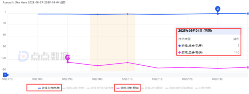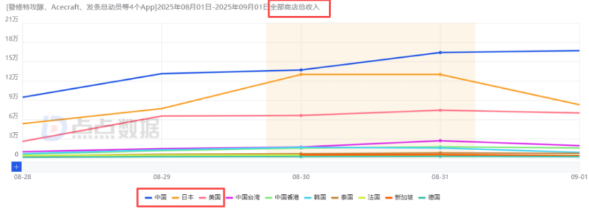 回到8月28日的全球公测,这款游戏登陆了170多个国家和地区,提前一天开启预下载,当天iOS日下载量达到25.4万(因数据延迟,统计未包含国内安卓端与海外谷歌端,下同),公测首日数据攀升至44.5万以上,还成功登上88个区域市场的iOS游戏畅销榜TOP1(其中中国和**位列第1、美国第3、中国**第4、韩国第7),随后日下载量持续增长,截至8月31日约为50.2万左右。