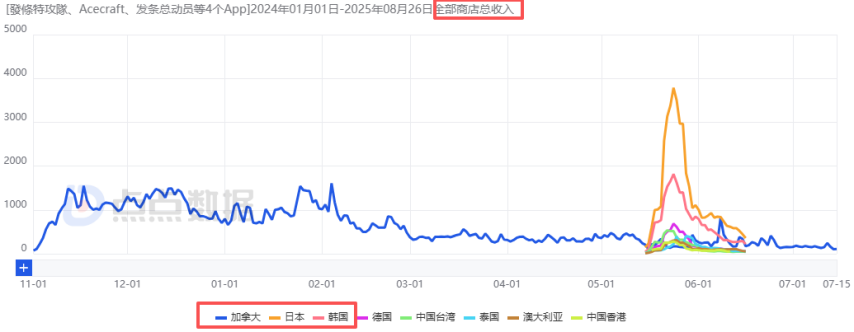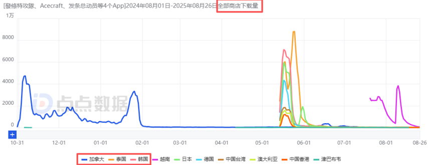 直到今年5月中旬,这款游戏再次扩大测试规模,登陆日本、韩国、中国香港及东南亚部分市场。当时,游戏的日下载量峰值约为3万,日流水峰值在6万元上下,不过大约两周后,此次测试的数据便基本回落至常规水平。值得一提的是,在公测前的国外小规模测试阶段,游戏累计下载量约达46.5万(其中加拿大、泰国、韩国位居前三),流水约为180万(加拿大、韩国位列前三),但该游戏似乎并未在美国市场进行过测试。