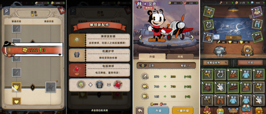 长线养成方面,以“改造”(天赋树)为核心,配件之间能触发组合效果,另外还有角色(升级、共鸣等)、僚机、装备与合成系统等。