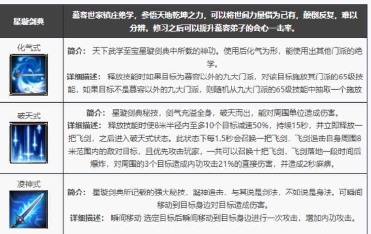 慕容一脉的精髓,在于那句广为人知的「以彼之道,还施彼身」。其独步武林的绝技【化气式】,能直接摄取其余九大门派的不传之秘为己所用——这也使得在PK对决里,你永远猜不透对面的慕容弟子,下一刻会施展出何等意想不到的招式。