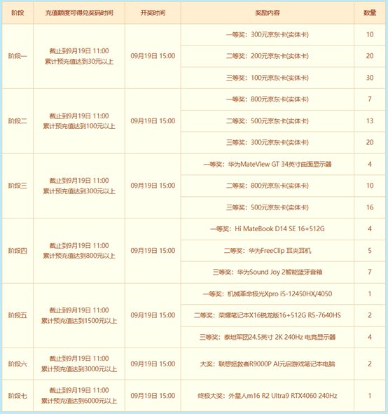 9月19日11:00预充值截止之前,在新服“重臻极境”服务器预充值即可参与预充值大派送活动。