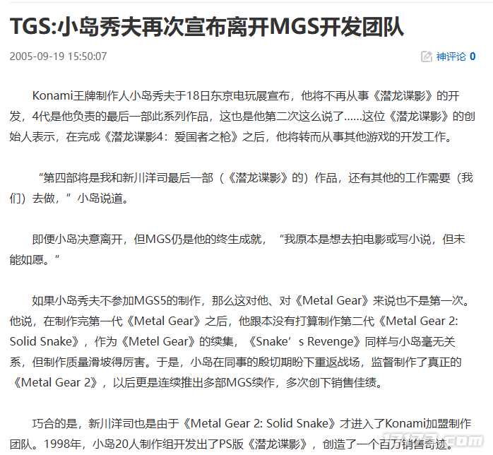 回望2005年的这篇报道,那时恰逢小岛秀夫在当年的TGS上为《合金装备4》做宣传。其实在那个时候,他心里已经有了离开的念头。不过后来的事情大家都清楚,最终成为他在Konami时期最后一部《合金装备》系列作品的,是2015年推出的《合金装备5:幻痛》——这部作品带着遗憾,未能完成全部创作构想。