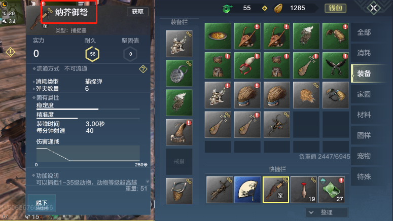 1、玩家在捕捉宠物前要先准备好“捕捉枪”,这是专门用于捕捉宠物的工具。游戏前期系统会指导玩家制作捕捉枪,不过捕捉枪有耐久度限制,一旦耐久度耗尽就会损坏,玩家需要重新合成制作捕捉枪才能继续进行捕捉操作。